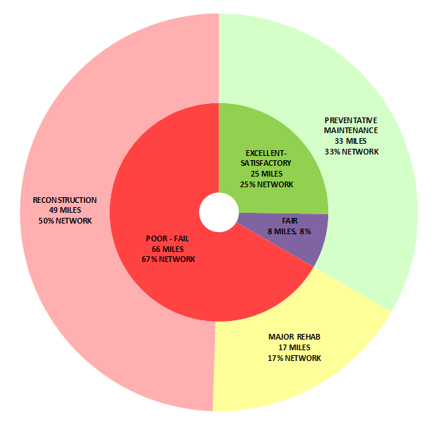 - 67% (66 miles) of City streets are beyond basic repair and maintenance and require repair or complete reconstruction