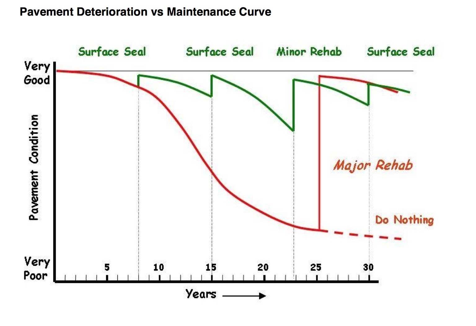 - Pavement Deterioration versus Maintenance Curve (JPG): Preventive maintenance treatments performed systematically during the first 75% of the life span is key to providing the most cost-effective method for extending the life of a paved surface. Re-paving a street once it has deteriorated to an OCI of 25 or less requires costly treatments, such as full reconstruction, which may cost more than twice as much as the sum of the preventative treatments made during the same time period.