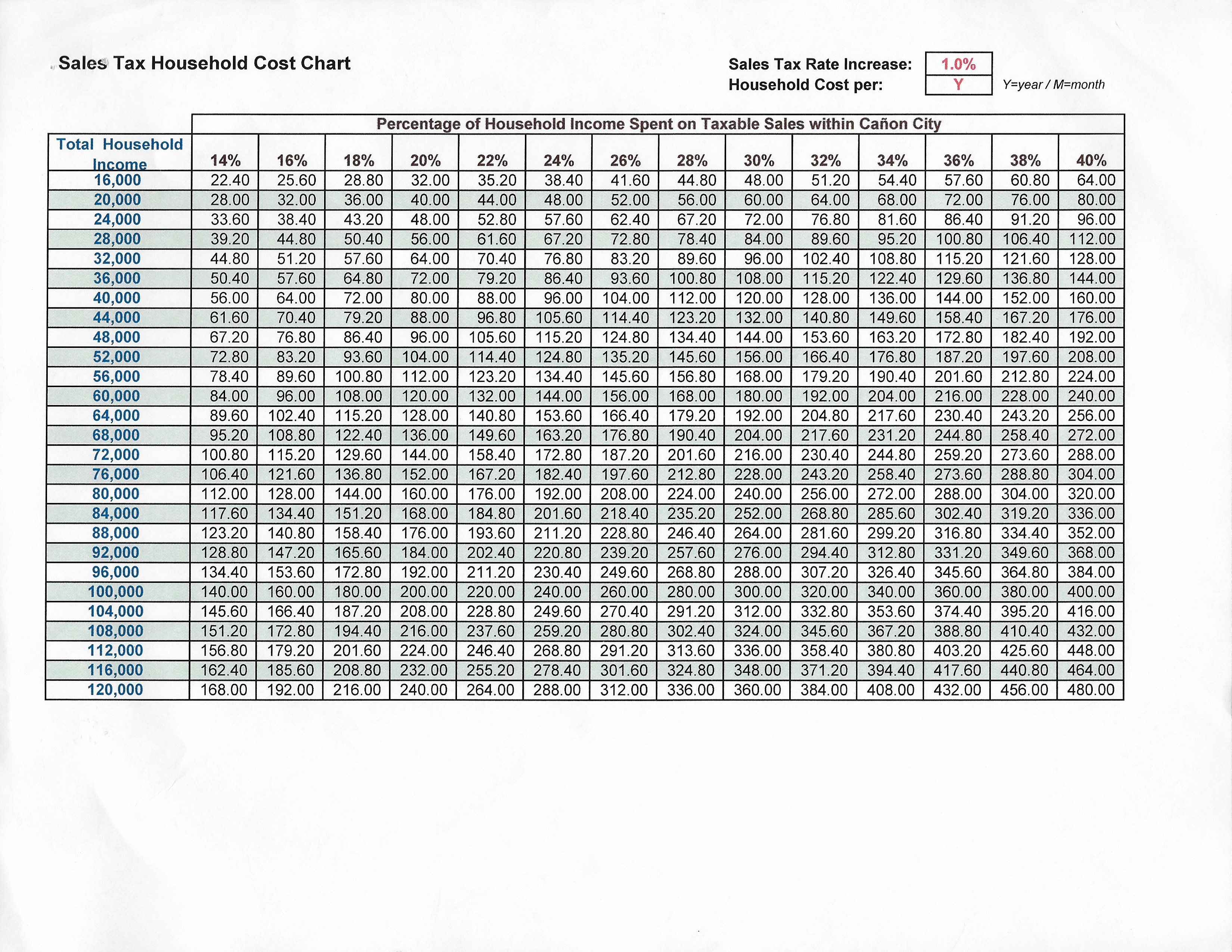 - Sales Tax Chart (JPG): A 1% sales tax would cost a median household income of $40,000 (that spends 20% locally on sales taxable items) $80 per year. Additionally, every county resident and tourist who shops at our stores and drives on our roads would also help pay to fix and maintain our streets.